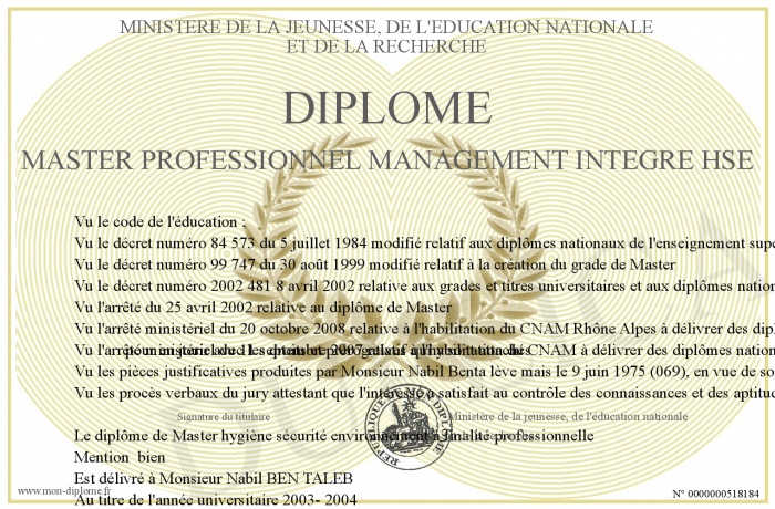 Envoyez par email votre Diplôme MASTER PROFESSIONNEL MANAGEMENT INTEGRE HSE personalisé