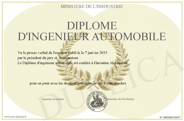 Envoyez par email votre Diplôme d'ingénieur automobile personalisé