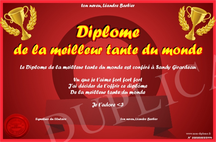 Envoyez par email votre Diplôme de la meilleur tante du monde personalisé