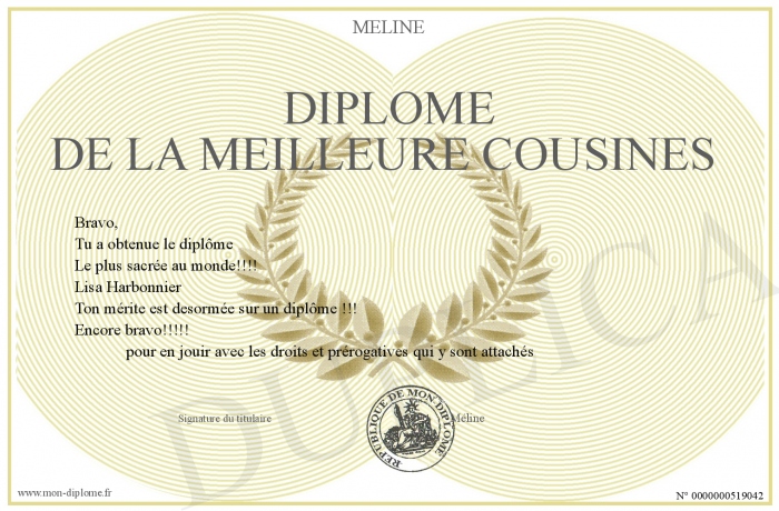 Envoyez par email votre Diplôme de la meilleure cousines personalisé
