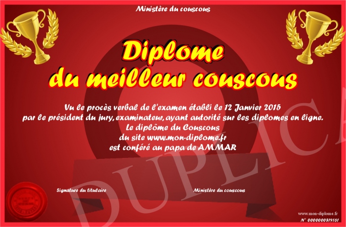 Envoyez par email votre Diplôme du meilleur couscous personalisé