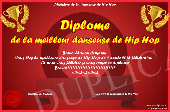Envoyez par email votre Diplome de la meilleur danseuse de Hip Hop personalisé