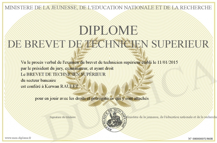 Envoyez par email votre Diplôme de Brevet de technicien supérieur personalisé