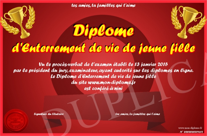 Envoyez par email votre Diplome d'Enterrement de vie de jeune fille personalisé