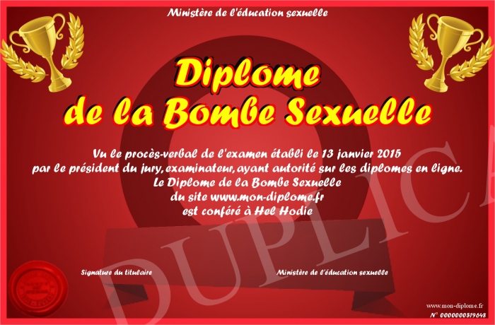 Envoyez par email votre Diplôme de la Bombe Sexuelle personalisé
