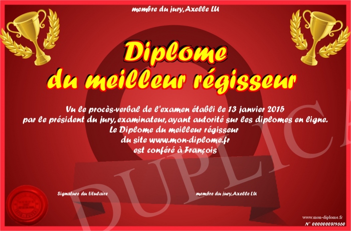 Envoyez par email votre Diplôme du meilleur régisseur personalisé
