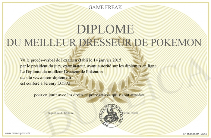 Envoyez par email votre Diplôme du meilleur Dresseur de Pokémon personalisé
