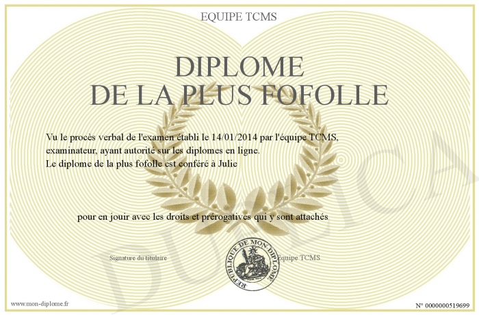 Envoyez par email votre Diplôme de la plus fofolle personalisé