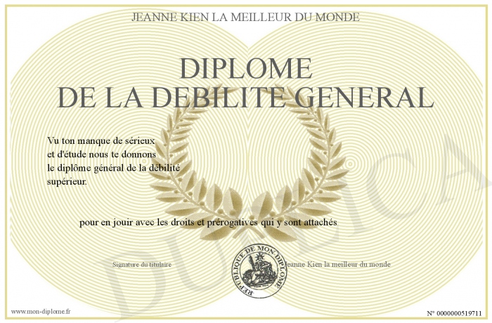 Envoyez par email votre Diplôme de la débilité général personalisé