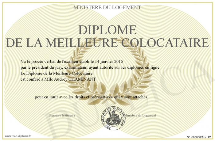 Envoyez par email votre Diplôme de la Meilleure Colocataire personalisé