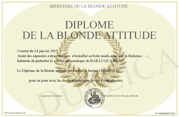 Envoyez par email votre Diplôme de la blonde attitude personalisé