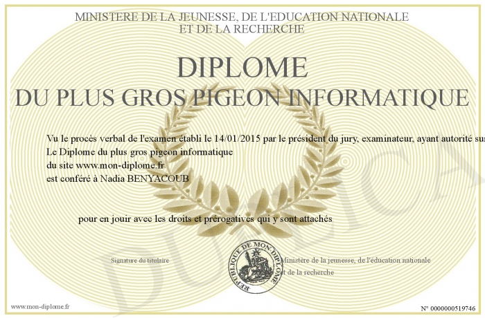Envoyez par email votre Diplôme du plus gros pigeon informatique personalisé