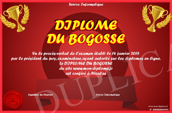 Envoyez par email votre DIPLOME DU BOGOSSE personalisé