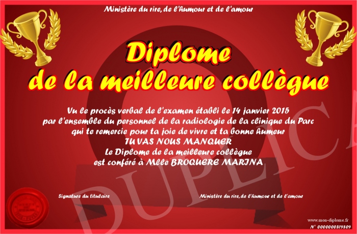 Envoyez par email votre Diplome de la meilleure collègue personalisé