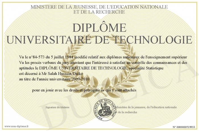 Envoyez par email votre DIPLÔME UNIVERSITAIRE DE TECHNOLOGIE personalisé