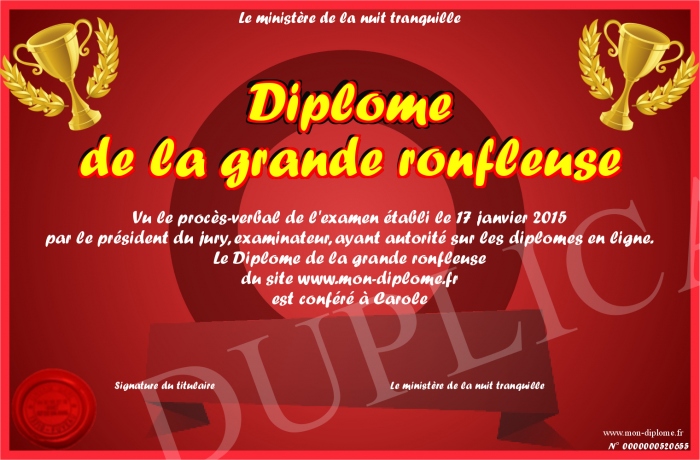 Envoyez par email votre Diplôme de la grande ronfleuse personalisé