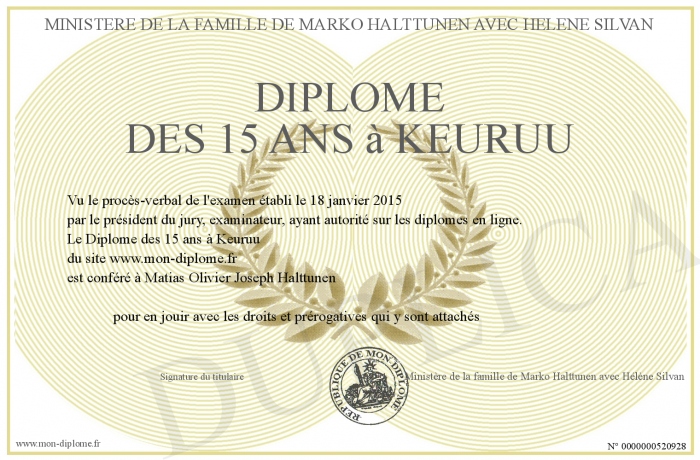 Envoyez par email votre Diplôme des 15 ans à Keuruu personalisé