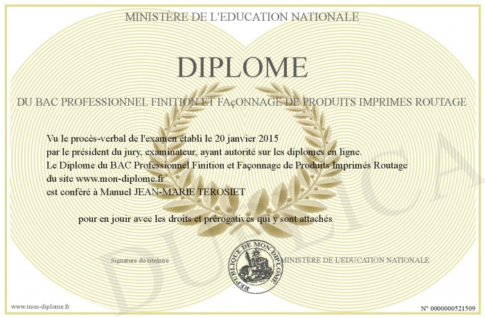 Envoyez par email votre Diplôme du BAC Professionnel Finition et Façonnage de Produits Imprimés Routage personalisé