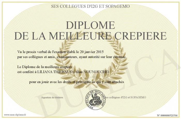 Envoyez par email votre Diplôme de la meilleure crepiere personalisé