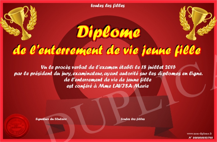Envoyez par email votre Diplôme de l'enterrement de vie jeune fille personalisé