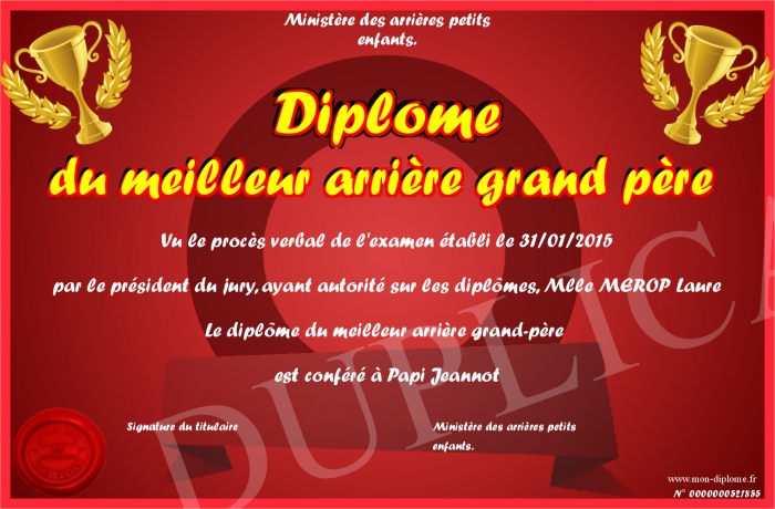 Envoyez par email votre Diplôme du meilleur arrière grand père personalisé