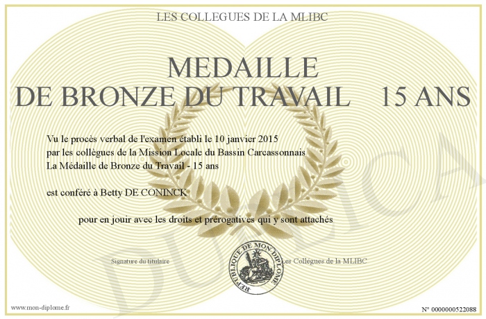 Envoyez par email votre Médaille de Bronze du Travail 15 ans personalisé