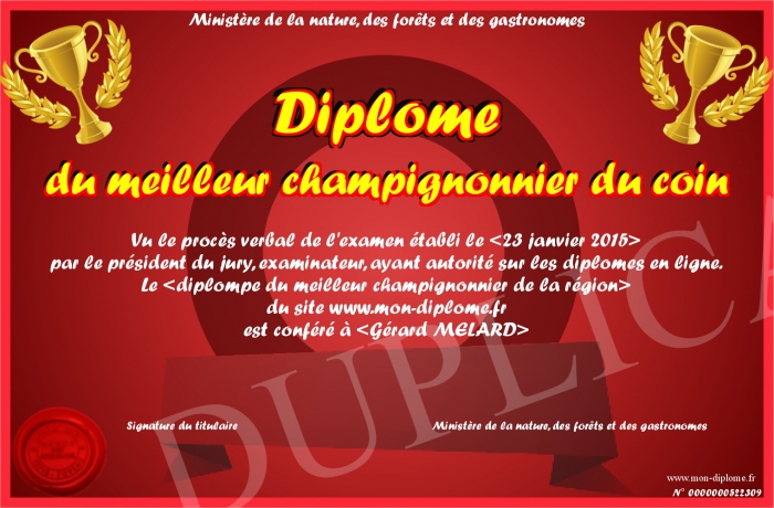 Envoyez par email votre Diplôme du meilleur champignonnier du coin personalisé