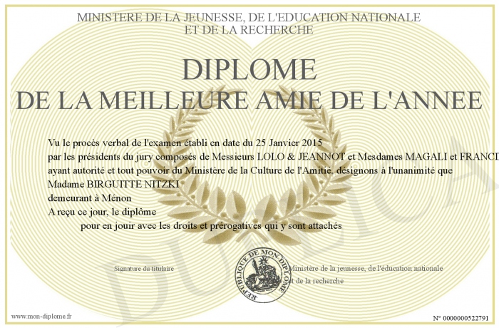 Envoyez par email votre Diplôme de la Meilleure Amie de l'Année personalisé