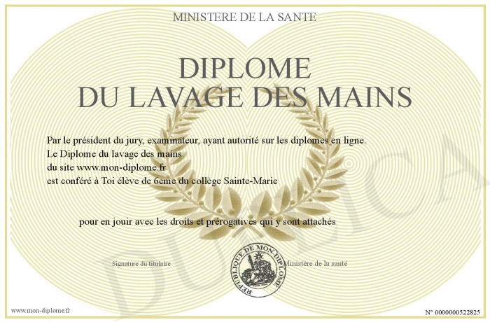 Envoyez par email votre Diplôme du lavage des mains personalisé