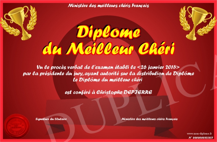 Envoyez par email votre Diplôme du Meilleur Chéri personalisé