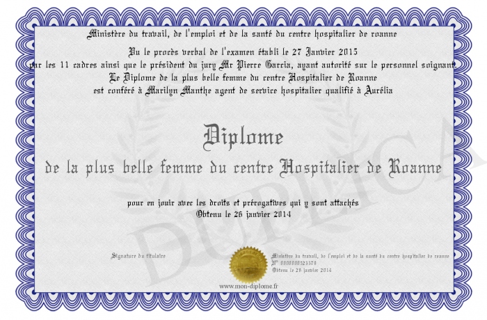 Envoyez par email votre Diplome de la plus belle femme du centre Hospitalier de Roanne personalisé