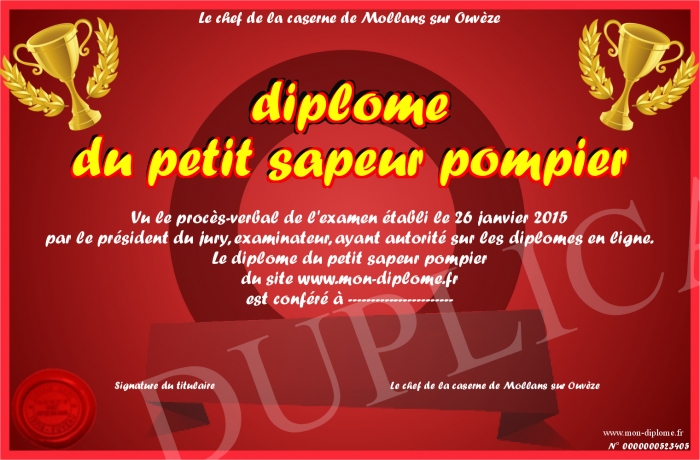 Envoyez par email votre diplome du petit sapeur pompier personalisé