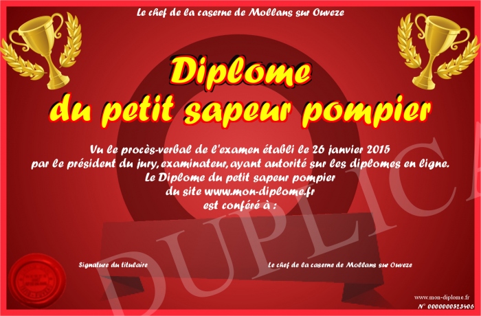 Envoyez par email votre Diplome du petit sapeur pompier personalisé