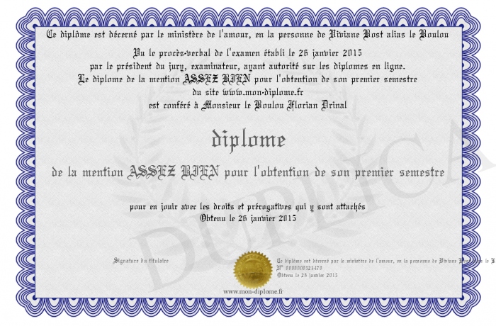 envoyé par le Ce diplôme est décerné par le ministère de l'amour, en la personne de Viviane Bost alias le Boulou !