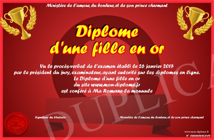 Envoyez par email votre Diplôme d'une fille en or personalisé