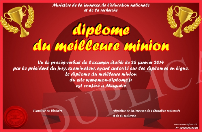 Envoyez par email votre diplôme du meilleure minion personalisé