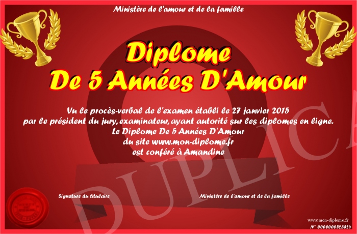 Envoyez par email votre Diplôme De 5 Années D'Amour personalisé
