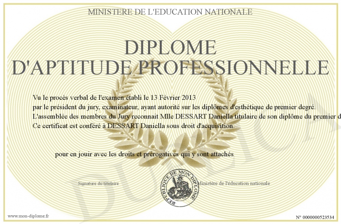 Envoyez par email votre Diplôme d'APTITUDE PROFESSIONNELLE personalisé