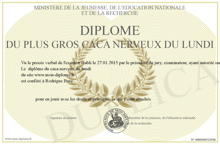 Envoyez par email votre Diplôme du plus gros caca nerveux du lundi personalisé