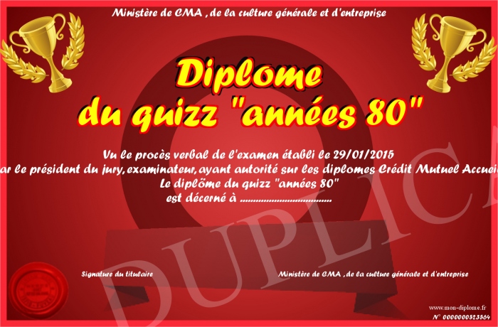 Envoyez par email votre Diplôme du quizz -années 80- personalisé