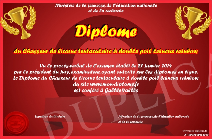 Envoyez par email votre Diplôme du Chasseur de licorne tentaculaire à double poil laineux rainbow personalisé