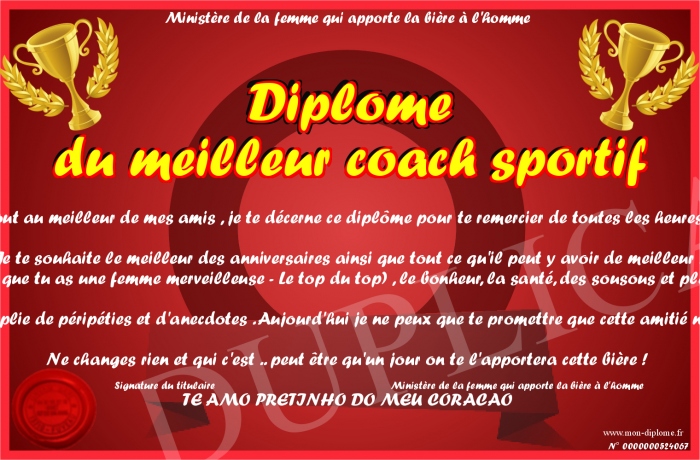 Envoyez par email votre Diplôme du meilleur coach sportif personalisé