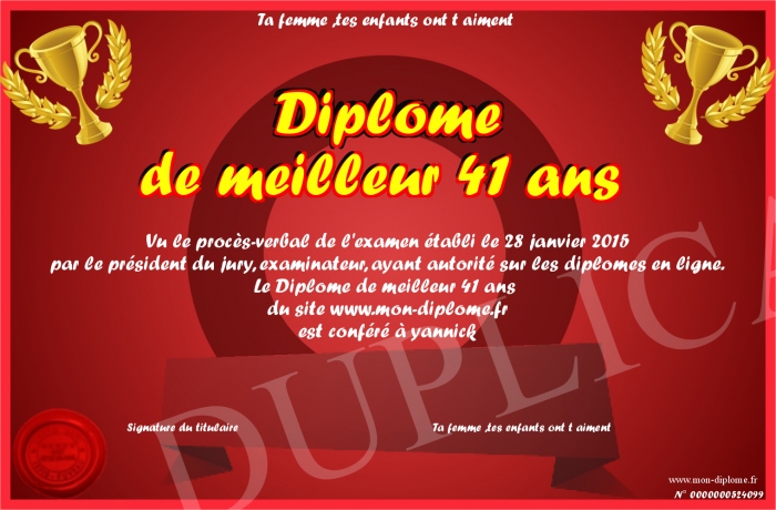 Envoyez par email votre Diplôme de meilleur 41 ans personalisé