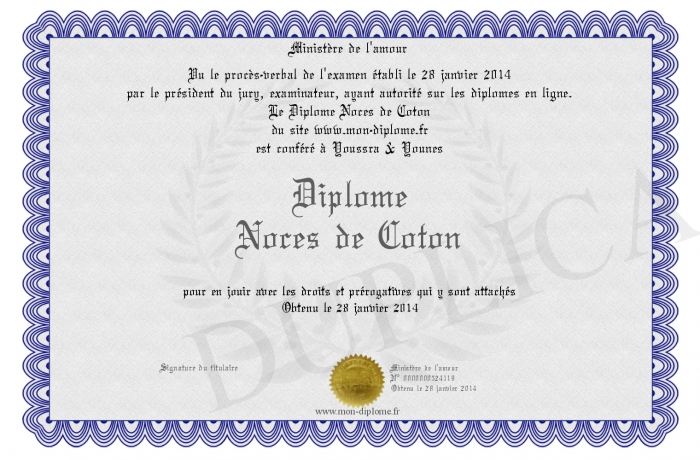 Envoyez par email votre Diplôme Noces de Coton personalisé