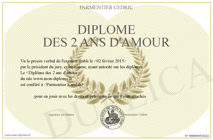 Envoyez par email votre Diplome des 2 ans d'amour personalisé