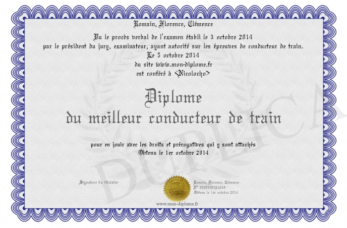 Envoyez par email votre Diplôme du meilleur conducteur de train personalisé