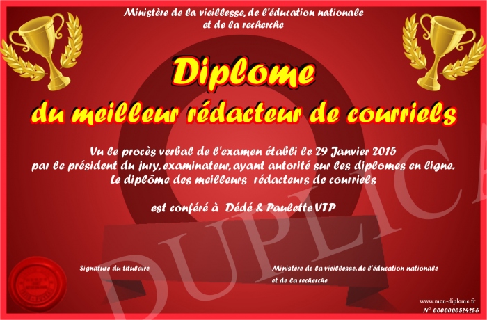 Envoyez par email votre Diplôme du meilleur rédacteur de courriels personalisé