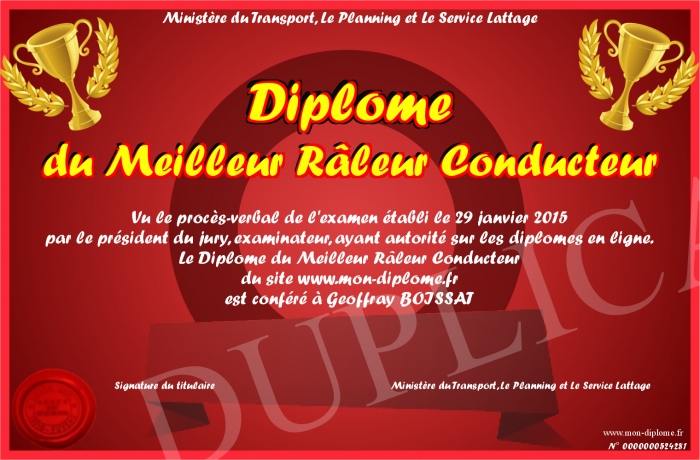 Envoyez par email votre Diplôme du Meilleur Râleur Conducteur personalisé