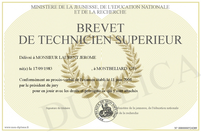 Envoyez par email votre BREVET DE TECHNICIEN SUPERIEUR personalisé
