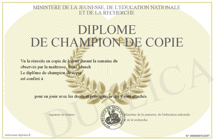 Envoyez par email votre Diplôme de Champion de Copie personalisé